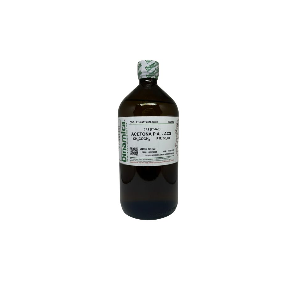 Acetona PA-ACS 1 Litro CAS 67-64-1 Dinâmica é um solvente orgânico de alta pureza amplamente utilizado em laboratórios e indústrias. O produto possui grau de pureza PA-ACS que significa Puro para Análise conforme padrões da American Chemical Society, garantindo qualidade superior para análises químicas e procedimentos laboratoriais precisos. Vem em embalagem com 1 litro ou 1000 mililitros. O número CAS 67-64-1 é o registro internacional único deste composto. É fabricado pela Dinâmica, marca reconhecida no mercado de produtos laboratoriais. A acetona é um líquido incolor, volátil e com odor característico adocicado, sendo a cetona mais simples e um dos solventes mais utilizados. É amplamente empregada como solvente para limpeza de vidrarias e equipamentos de laboratório, extração e purificação de compostos orgânicos, cromatografia, síntese química, removedor de esmaltes e tintas, desengraxante, e como reagente em diversas análises. Por ser extremamente inflamável e volátil deve ser manuseado em ambientes bem ventilados, longe de chamas, faíscas e fontes de calor, seguindo rigorosas normas de segurança laboratorial. Deve ser armazenado em local fresco, ventilado e em recipientes hermeticamente fechados longe de oxidantes. O produto pode causar irritação nos olhos e vias respiratórias, ressecamento da pele e sonolência por inalação prolongada. Deve ser utilizado com equipamentos de proteção individual adequados como luvas, óculos de segurança e máscara em ambientes fechados.