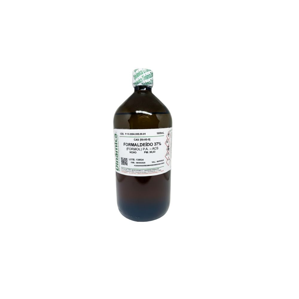 Formaldeído 37% PA-ACS CAS 50-00-0 Dinâmica é uma solução de aldeído fórmico de alta pureza com concentração de 37% e grau PA-ACS garantindo qualidade superior. É fabricado pela Dinâmica. Também conhecido como formol, apresenta-se como solução aquosa incolor com odor forte e irritante. Utilizado como fixador de tecidos em histologia e anatomia patológica, conservante de amostras biológicas, desinfetante, reagente em sínteses químicas, produção de resinas e preparo de soluções preservativas. É o fixador mais usado em patologia para preservar estruturas celulares. É altamente tóxico, carcinogênico e irritante devendo ser manuseado em capela de exaustão com luvas de nitrila, óculos, avental e máscara com filtro. Causa irritação severa nos olhos, pele e vias respiratórias e exposição crônica está associada a câncer. Armazenar em frasco fechado em local fresco, ventilado e protegido da luz. Resíduos devem ser descartados conforme normas ambientais.