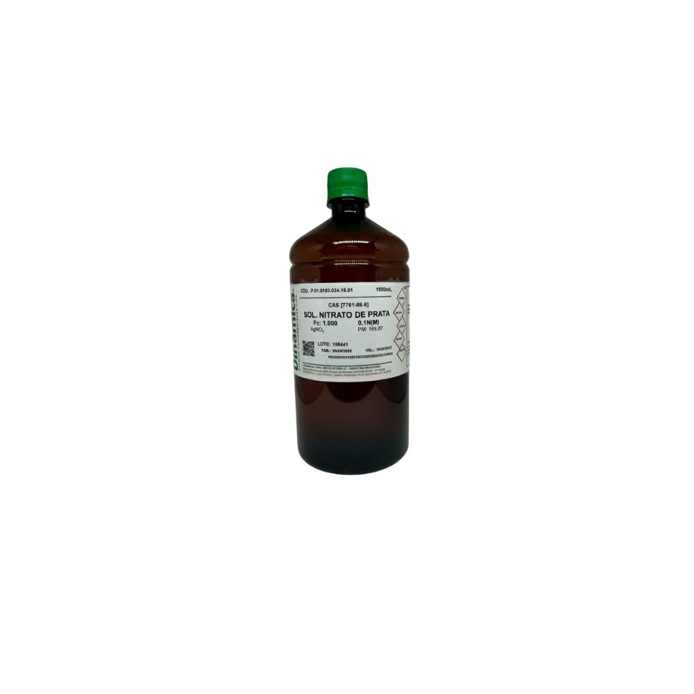 Solução Nitrato de Prata 0,1 N/0,1M Dinâmica é uma solução padronizada utilizada em análises químicas volumétricas. Possui concentração de 0,1 Normal ou 0,1 Molar e é fabricada pela Dinâmica. Apresenta-se como líquido incolor que pode escurecer com exposição à luz. Utilizada em titulações argentométricas para determinação de cloretos, brometos e iodetos, análises de haletos em água, alimentos e produtos químicos, controle de qualidade industrial e análises ambientais. Métodos de Mohr e Volhard utilizam este reagente. Por ser fotossensível deve ser armazenada em frasco âmbar protegida da luz em local fresco. O nitrato de prata é oxidante e pode manchar pele e roupas permanentemente devendo-se usar luvas e avental. Manter longe de materiais orgânicos e redutores.