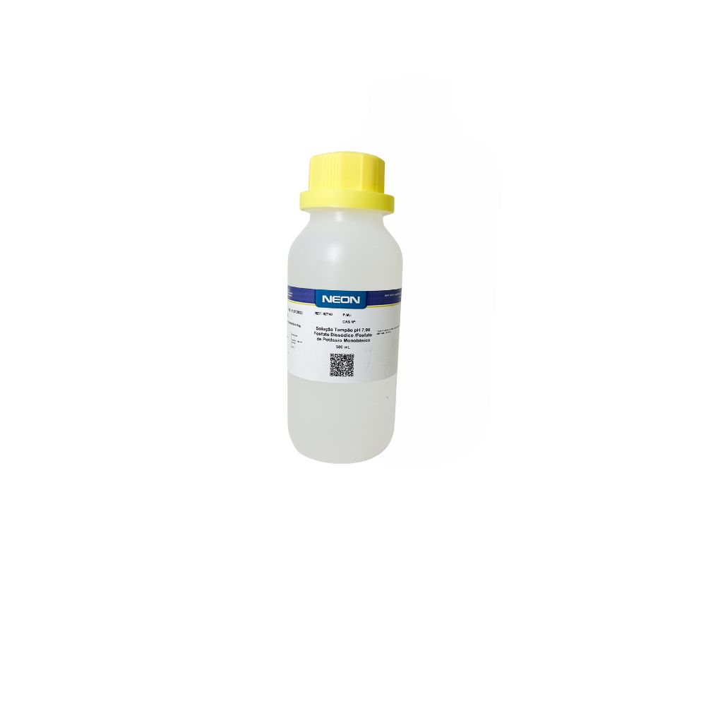 Solução tampão padrão com pH calibrado em 7,00, composta por fosfato dissódico e fosfato de potássio monobásico, fornecida pela marca Neon. Utilizada para calibração e aferição de medidores de pH (pHmetros), como padrão de referência em análises laboratoriais e controle de qualidade em laboratórios químicos, ambientais, clínicos e industriais. Produto pronto para uso, com pH neutro fixo e estável, rastreável a padrões certificados, garantindo precisão e confiabilidade nas medições de equipamentos analíticos. Essencial para verificação do ponto neutro em calibrações de pH.